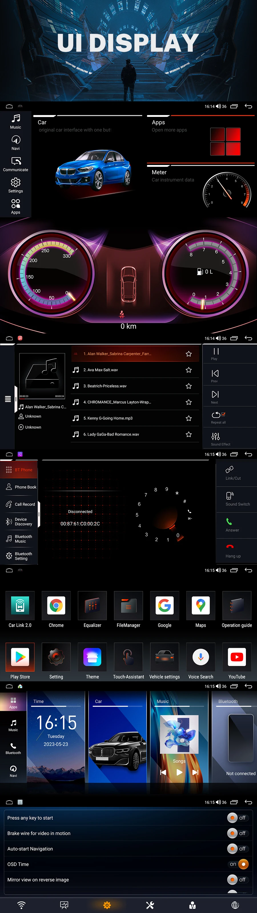 Also add to Navirider Android system – bluetooth, USB music/video playback – wifi/4G network – CarPlay/Android AUTO function – map – playtore – third party apps and more etc. |