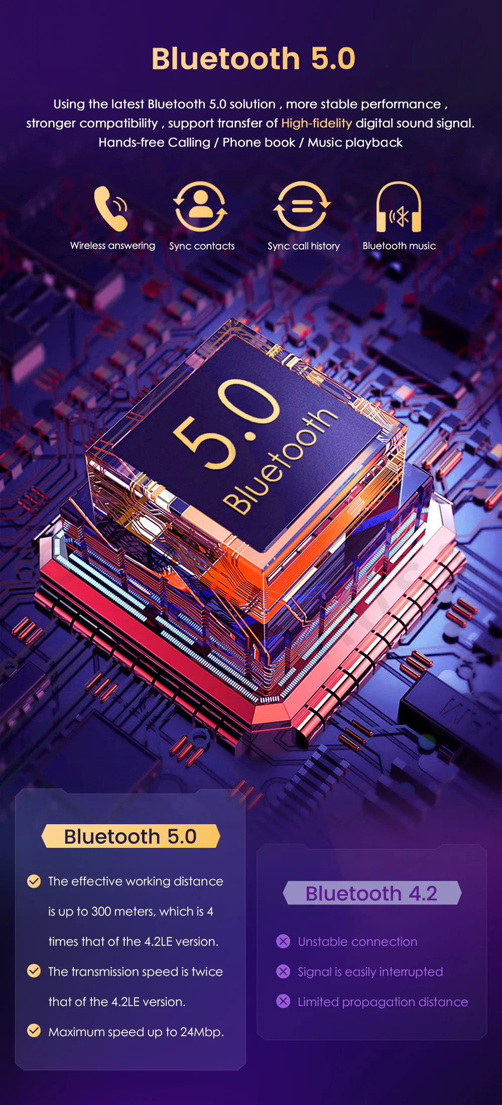 7. EQ balanced audio processing technology and Blutoothe 5.0 audio and hands-free calling.