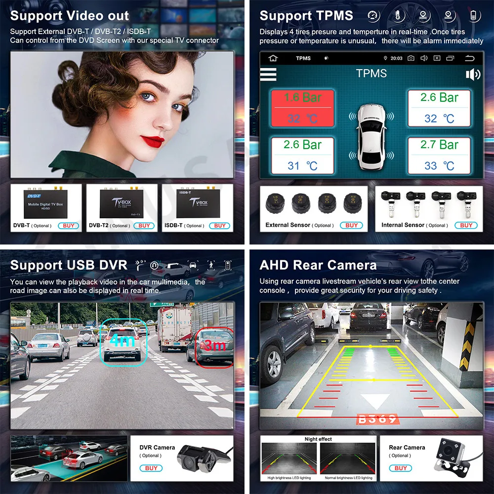 12. Support external 4G Dongle/TPMS/USB connection/Digital TV/OBDⅡ/DAB+