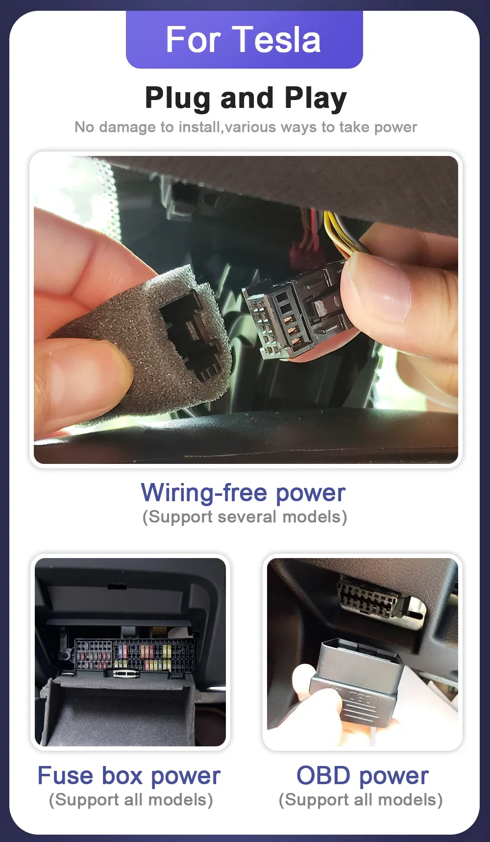 No damage to install, various ways to take power. The model for Tesla X AP 2.0 and S AP 2.0 take power from rear view mirror; The model for Tesla 3 and Tesla Y need to take power from the USB(rear back seat).