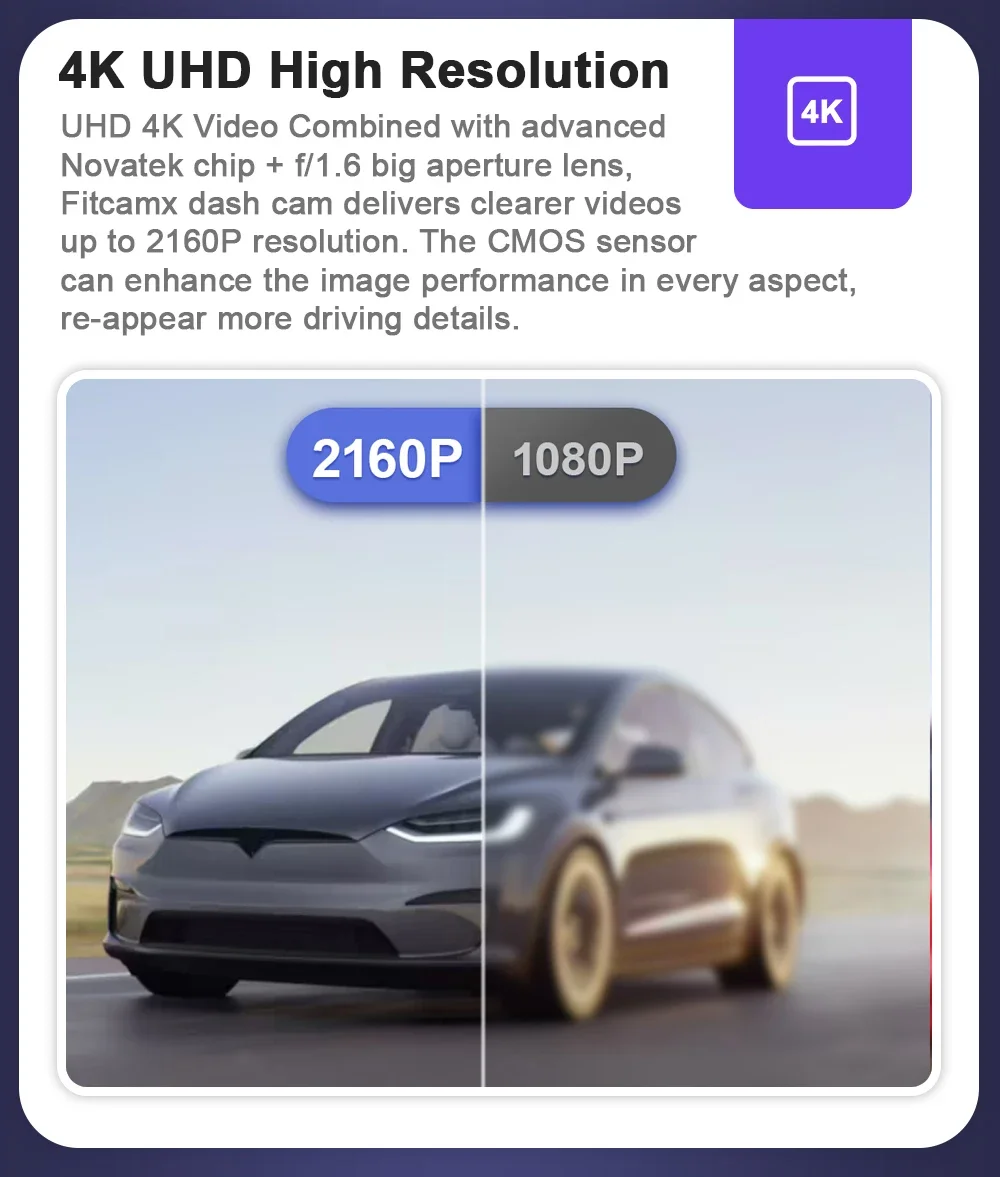 UHD 4K Video Combined with advanced Novatek chip + f/1.6 big aperture lens, Fitcamx dash cam delivers clearer videos up to 2160P resolution. The CMOS sensor can enhance the image performance in every aspect, re-appear more driving details.