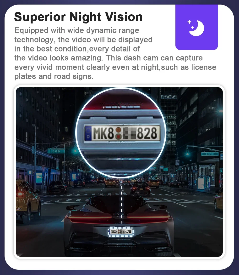 Equipped with wide dynamic range technology, the video will be displayed in the best condition, every detail of the video looks amazing. This dash cam can capture every vivid moment clearly even at night, such as license plates and road signs.