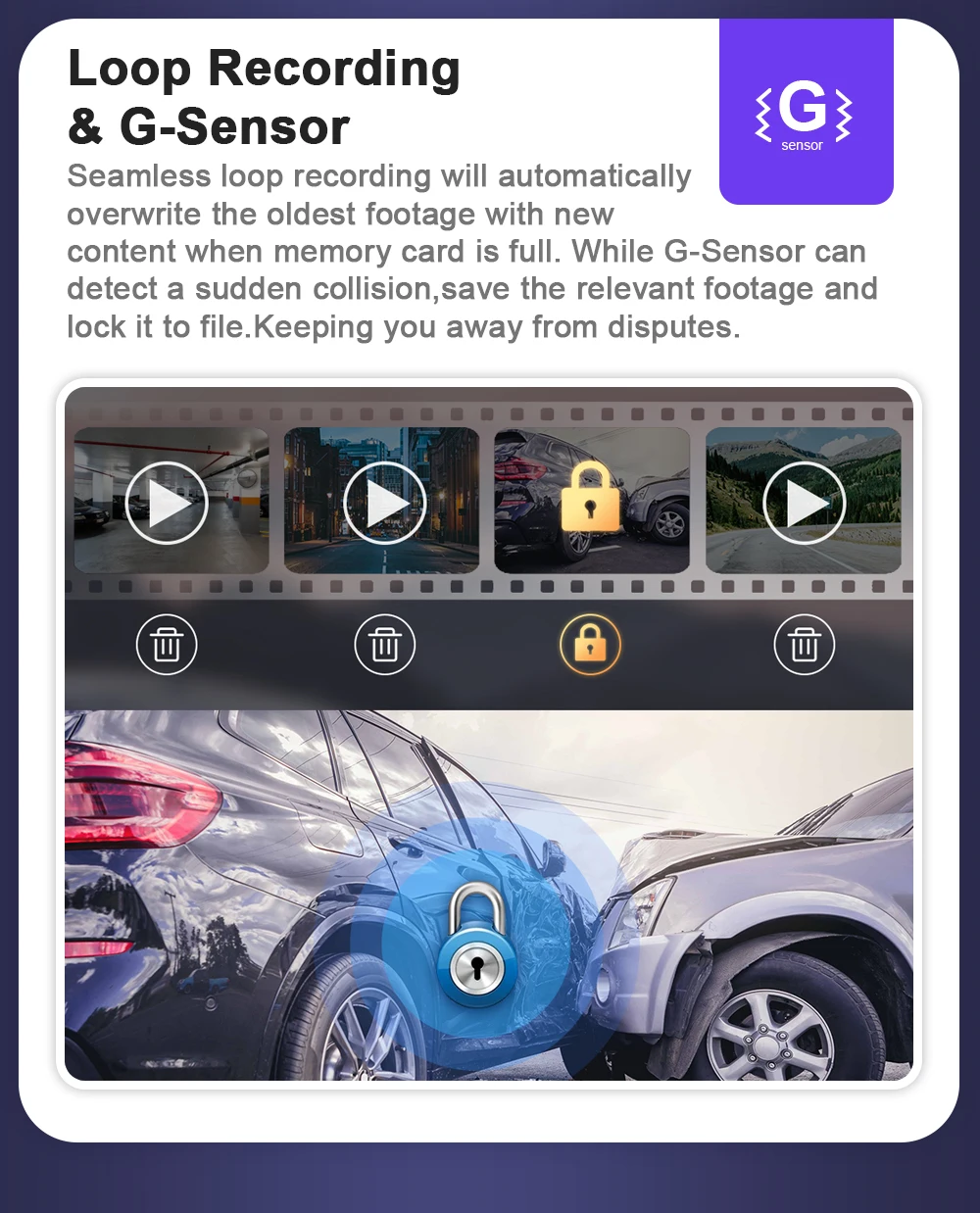 Seamless loop recording will automatically overwrite the oldest footage with new content when memory card is full. While G-Sensor can detect a sudden collision,save the relevant footage and lock it to file. Keeping you away from disputes.