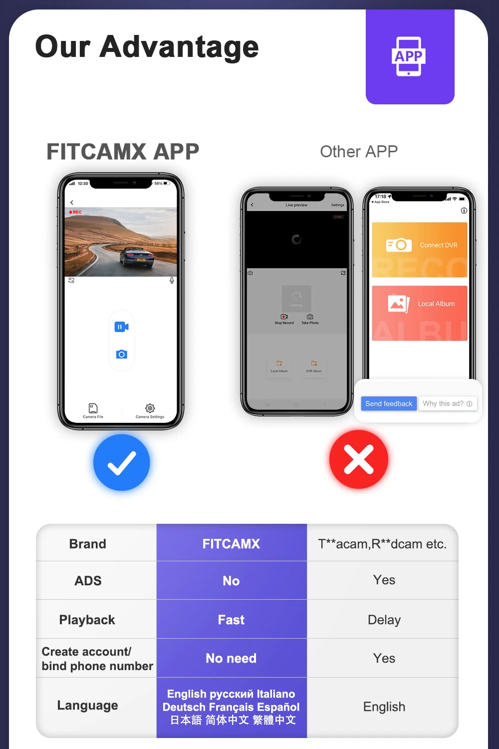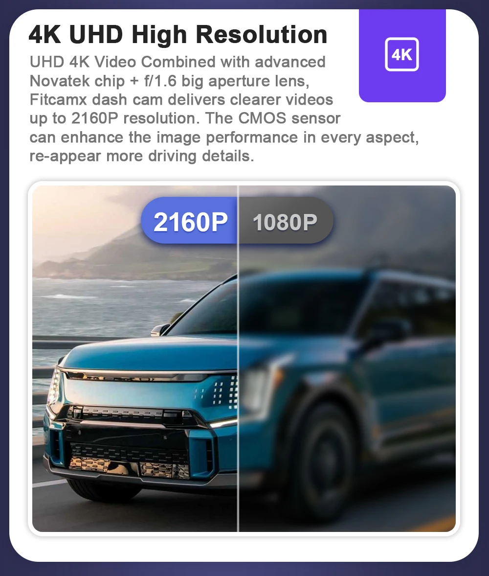 UHD 4K Video Combined with advanced Novatek chip + f/1.6 big aperture lens, Fitcamx dash cam delivers clearer videos up to 2160P resolution. The CMOS sensor can enhance the image performance in every aspect, re-appear more driving details.