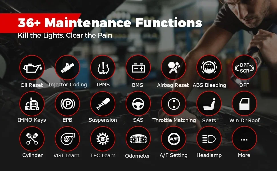 Oil Reset, EPB, BMS, ABS Bleed, TPMS, Airbag Reset, DPF Reg., IMMO Service, Injector Coding, SAS Calibration, Suspension Calibration, Throttle Adaption, ABS/SRS, Gear Learning, Sunroof Initialization, Seats Calibration, Language Change, Headlight Matching, A/F Setting, WIN DR Roof, Odometer, CHG Tire Size, Cylinder, Turbocharging, Limit, Trans Adaption.