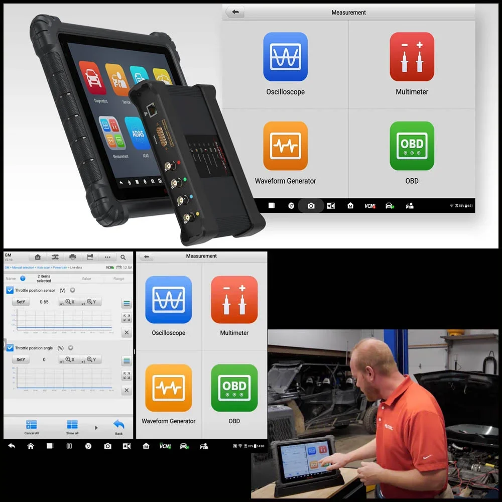 Except working as a diagnostic tool, it also functions as a 4-channel oscilloscope, waveform generator, multimeter, and CAN BUS tester.